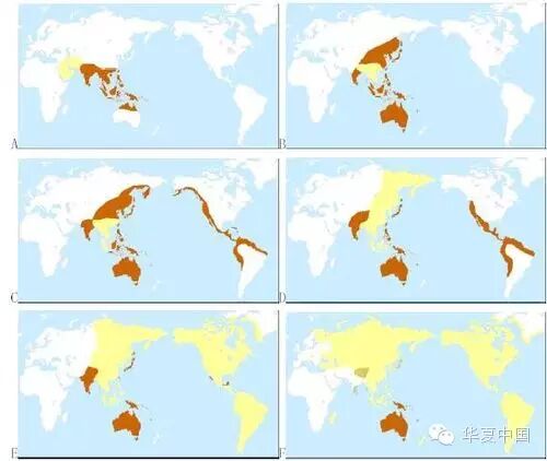 上图是推测棕色人种的分布变迁和黄色人种取代棕色人种的过程: