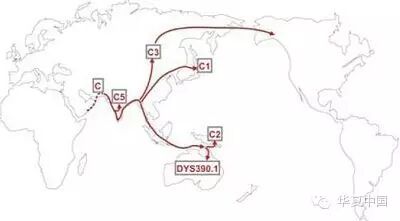 C=M130的迁徙路线大致是沿着海岸走过阿拉伯半岛—伊朗—印度—中南半岛,此后一支C1=M8向北进入中国东北、朝鲜半岛和日本列岛;一支C2=M38向南进入印尼、澳大利亚以致太平洋诸岛;第三支C3=M217向北进入西伯利亚直到北美地区。