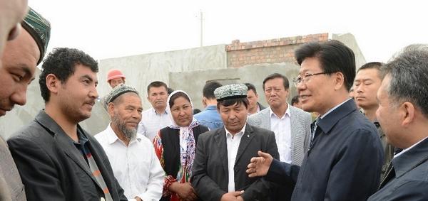 9月13日,中共中央政治局委员、自治区党委书记张春贤考察和田县和谐新村时和村民交谈。新疆日报记者李杨摄